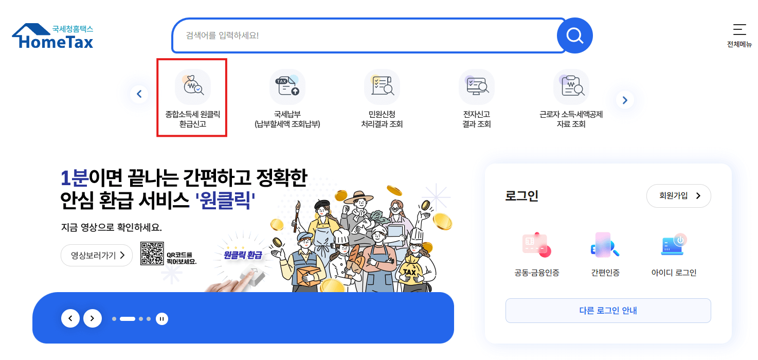 - 좌측 상단 배너 [종합소득세 원클릭 환급신고] 선택