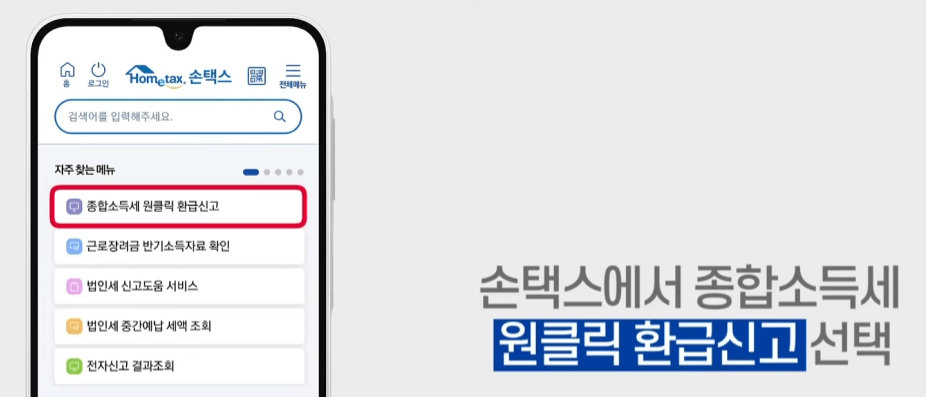 - 손택스 앱 실행 후, ‘종합소득세 원클릭 환급신고’ 선택